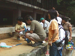 未明の雷鳴と豪雨、しかしながら観察会の始まる午後3時ごろはこのところの日和と変わらない夏の日差しが森にそそいでいました。今日の参加者はお客様27名、会員13名の40人でした。財賀寺は自然愛好家ではヒメハルゼミとムササビの棲む森として有名です。会としては平成11年6月6日、あのオオタカ出現の観察会以来5年ぶりの財賀寺観察会となりました。参加の子供たちが燃える昆虫の世界をゆっくりと観察し、日没後、ムササビの様子を観察しました。ちょっとした隙に、頭上を飛翔するムササビを眺めた方もいたようです。財賀寺のご住職さん、お世話になりました。
