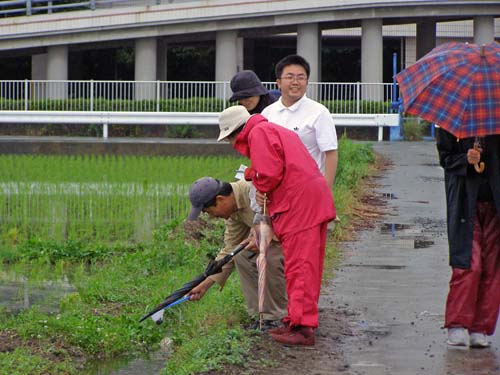豊橋公園・沖野・金色島の自然観察 第4回 定例自然観察会 2006.06.11 とよはし100祭サポート・イベント 天候:雨 今日の観察会は雨となりました。雨の自然観察会もまた、趣のあるものです。予想以上に多くの参加のみなさんと沖野の水田の生きもの達と豊橋公園に咲く花を観察できました。 2006年6月11日のテキスト 豊橋の巨木・名木のアメリカキササゲの花 テイカカズラの花 沖野の水田での観察風景 ホウネンエビ ナマズの稚魚 カブトエビ