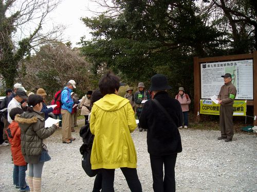 今日は2009年度最後のエコツアーでした。ヤマザクラ咲き、シデコブシも咲く、田原市藤七原湿地と衣笠山中腹の火打ち石採掘跡地を巡るツアーです。参加者はインタープリターと主催者側以外の方、45名程、子どもたちも来てくれました。また、本日はCOP10支援パートナーシップ事業の認定を受けての開催でした。