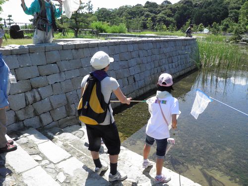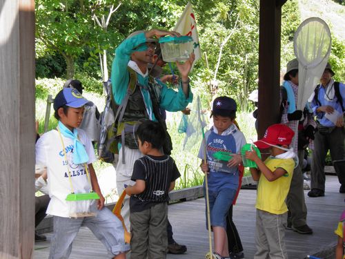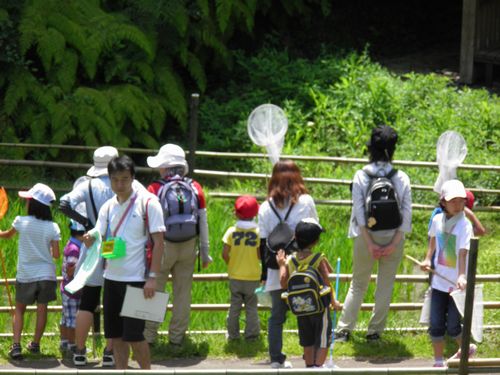 東三河ふるさと公園 第64回自然観察会 東三河ふるさと公園自然観察会 2011.07.17 天候:晴 参加者:一般56名、会員17名 猛暑の日である。今日のテーマは「夏休みだ!森の中で虫を探そう」ということで子どもたちの参加が目立った。 そのため、昆虫採集中心のグループと成人グループの2班で行動した。修景池でのトンボ採集、そしてそれぞれ捕まえたトンボや虫たちの同定を片山会員が解説をまじえて行った。 観察会終了後、ふるさと公園の管理者から子どもたちへのプレゼントとして「カブトムシ」が全員に配られた。 修景池畔の芝生の広場での森の観察 修景池での昆虫採集 四阿での採集した昆虫の解説 田んぼでの採集風景 満開のリョウブの花 カブトムシ配布の様子