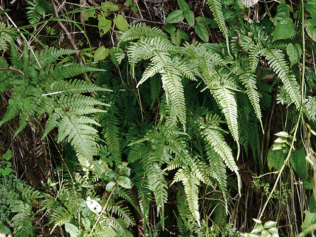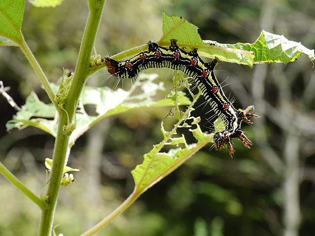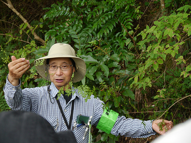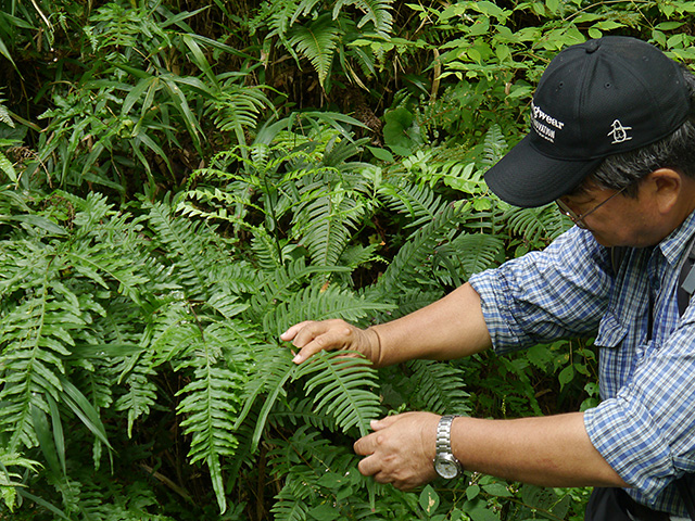 多くのシダ類、ひっつき虫、頭を振動させて威嚇するフクラスズメの幼虫、湿地の植物のミズトラノオやカモメヅルなどが観察できました。