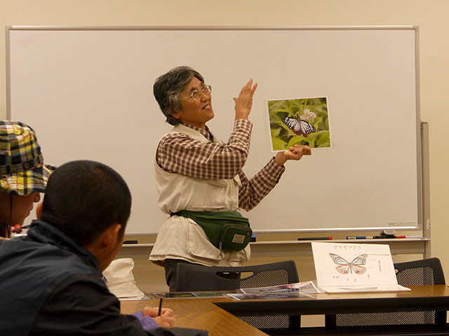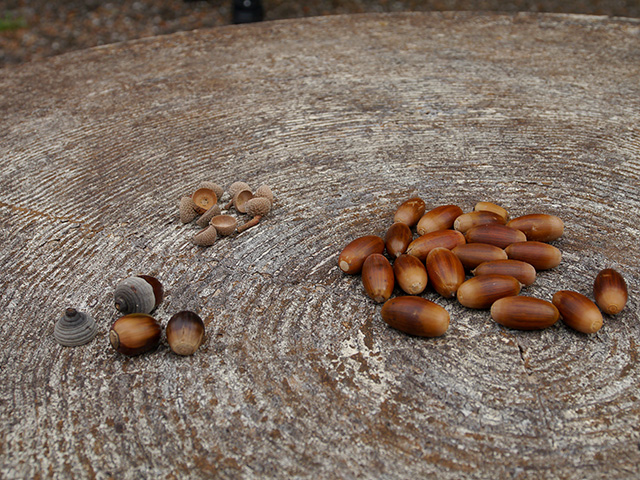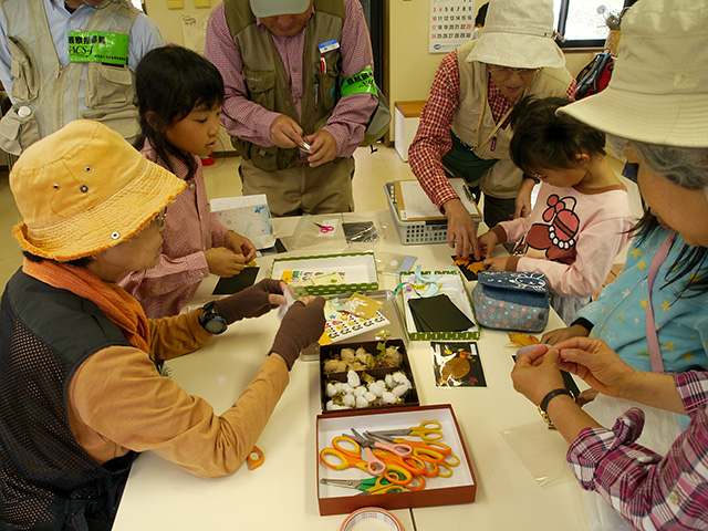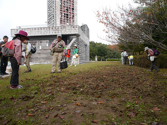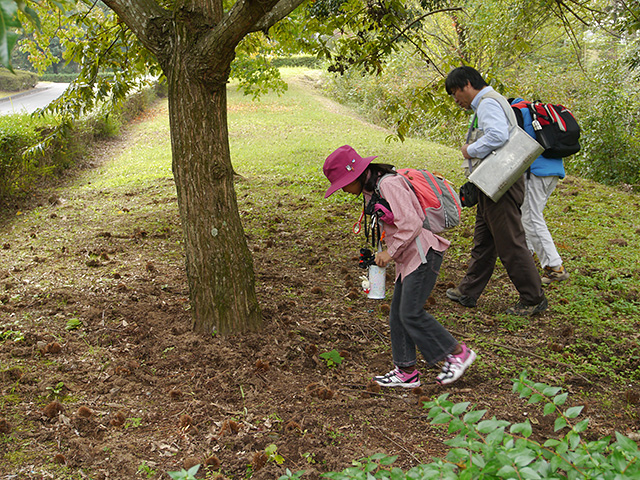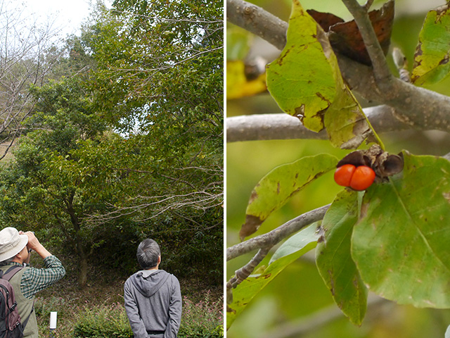 わんぱく広場管理棟前の春に観察したハナノキは紅葉していました。色々な樹木の果実やどんぐり、渡ってきたジョウビタキなど、秋ならではの生き物たちを観察できました。