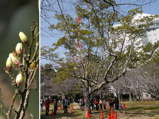 はじめに12月にも観察したオガタマノキを観察しました。樹勢回復作業中でしたが花は咲いていました。