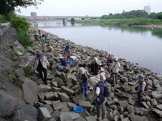 カニをよく観察するために、まず潮の引いている豊川に向かいました。会で用意した竿といろいろなエサを使い、参加者みなさんでカニ釣りをしました。カニが釣れたので、間近でよく観察することができました。