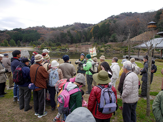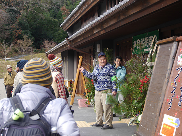 はじめに管理棟前で門松の解説をして、修景庭園に移動しました。