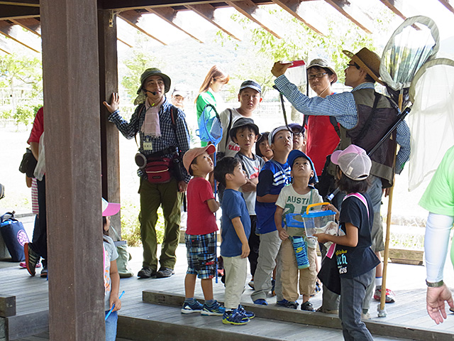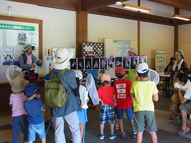 高林会員がセミの羽化の写真を紹介し、参加した子どもたちが興味深く見ていました。
