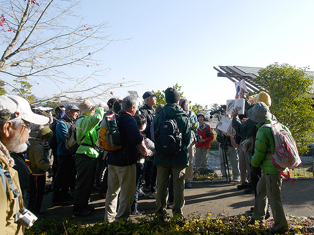 はじめに管理棟前でバードウォッチングの基本、双眼鏡の正しい使い方を解説・練習しました。