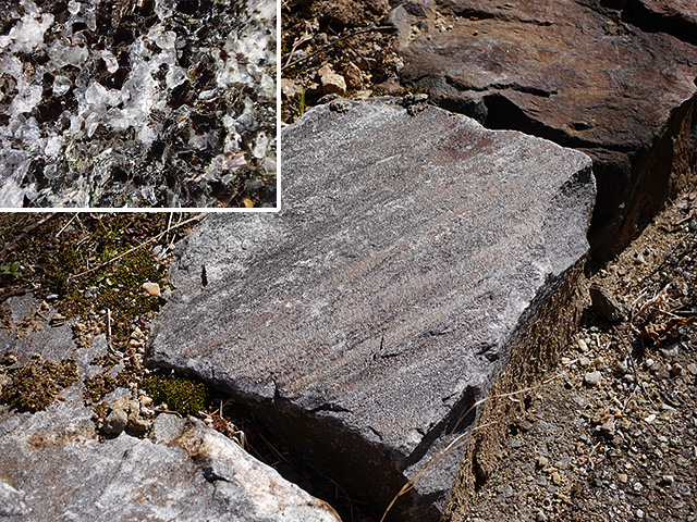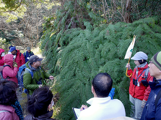 遊歩道脇の片麻岩やウラジロなどを観察しながら、展望ツツジ園を目指しました。