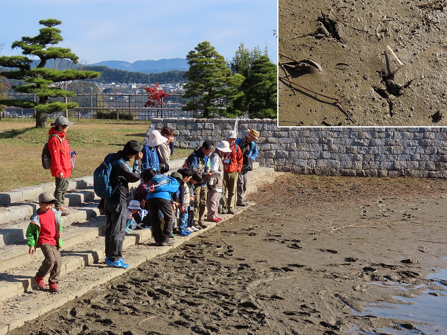子ども中心の班は修景庭園の池周辺で鳥の足跡や昆虫、秋の果実や花を観察しました。