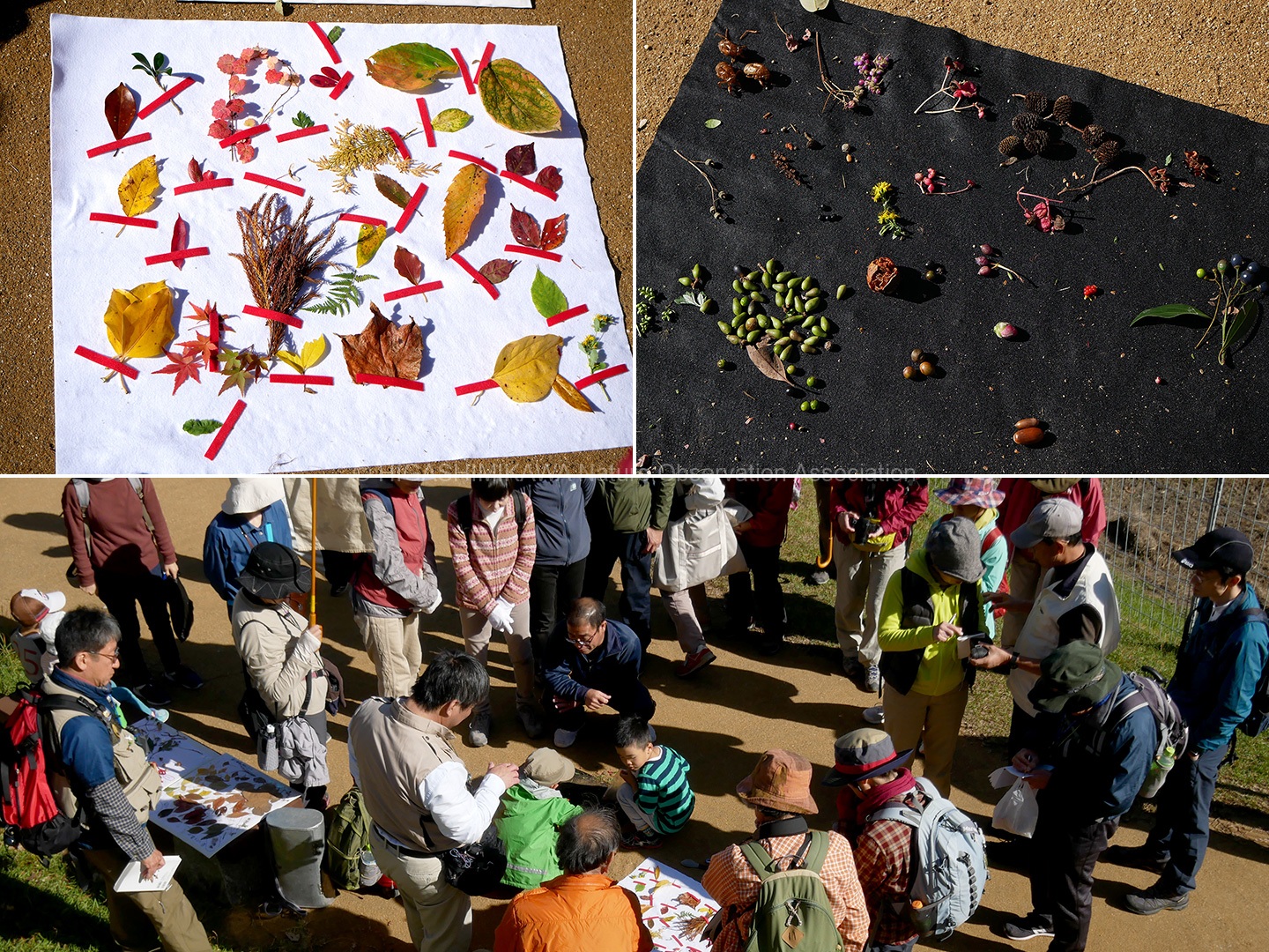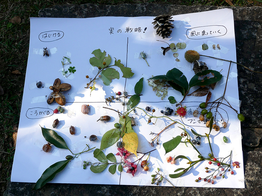 合流後にイロハカエデの翼果の舞う様子を確かめたり、タイミングよくカマキリから出てきたハリガネムシを観察できました。園内で見られた様々な葉や果実を集めてまとめました。
