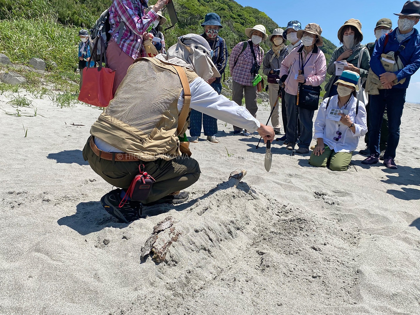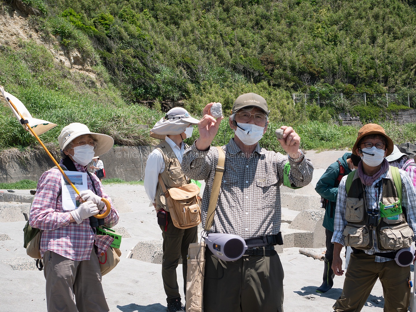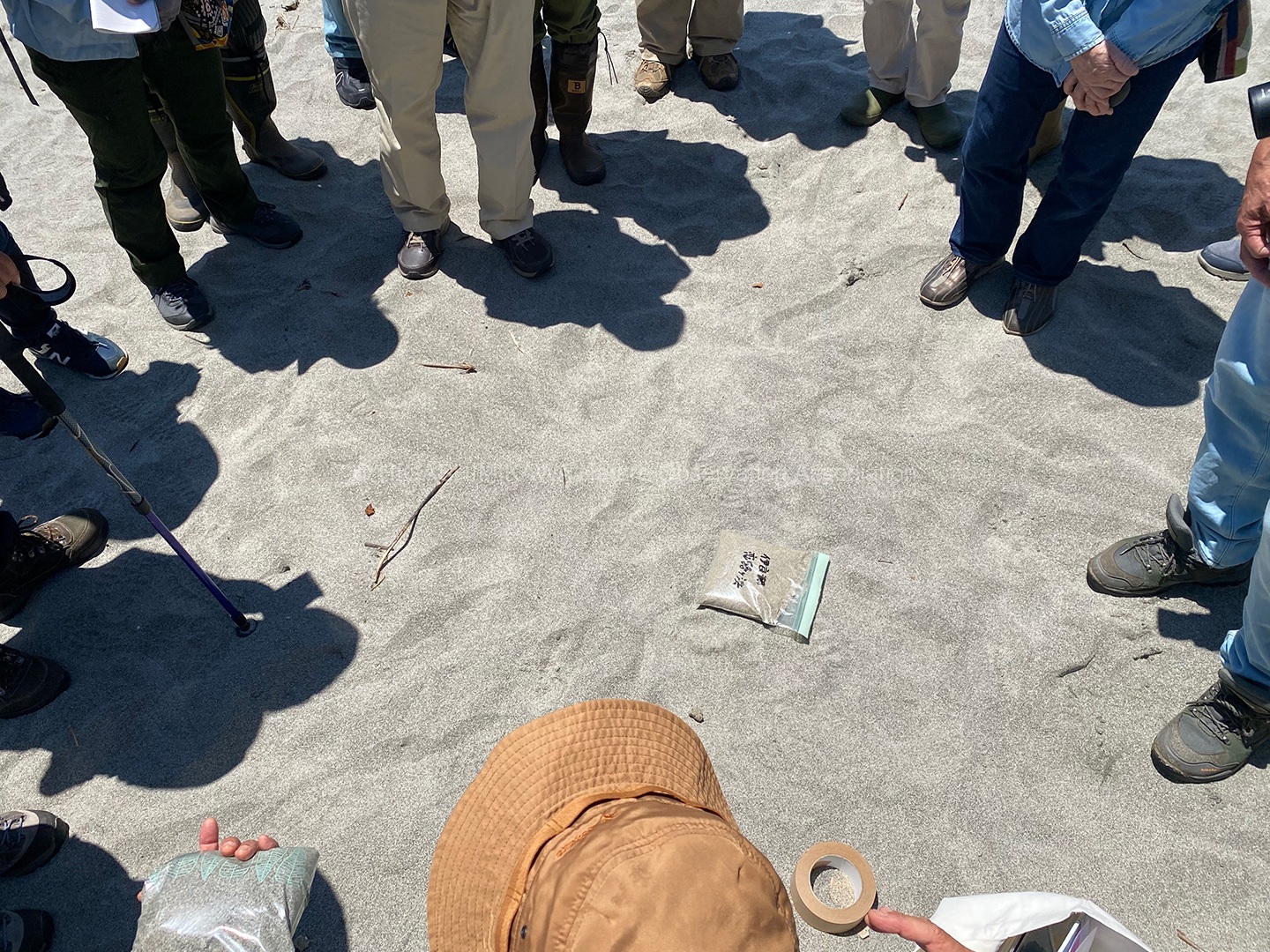 海岸ではハマボウフウやコウボウムギなどの海浜植物、海蝕崖、風紋などの砂浜の地形や漂着物の観察をしました。海蝕崖のでき方、水平線までの距離、海岸漂着ごみ、軽石、貝殻などは詳しく解説しました。伊古部の海岸のさまざまな自然を体感することができました。