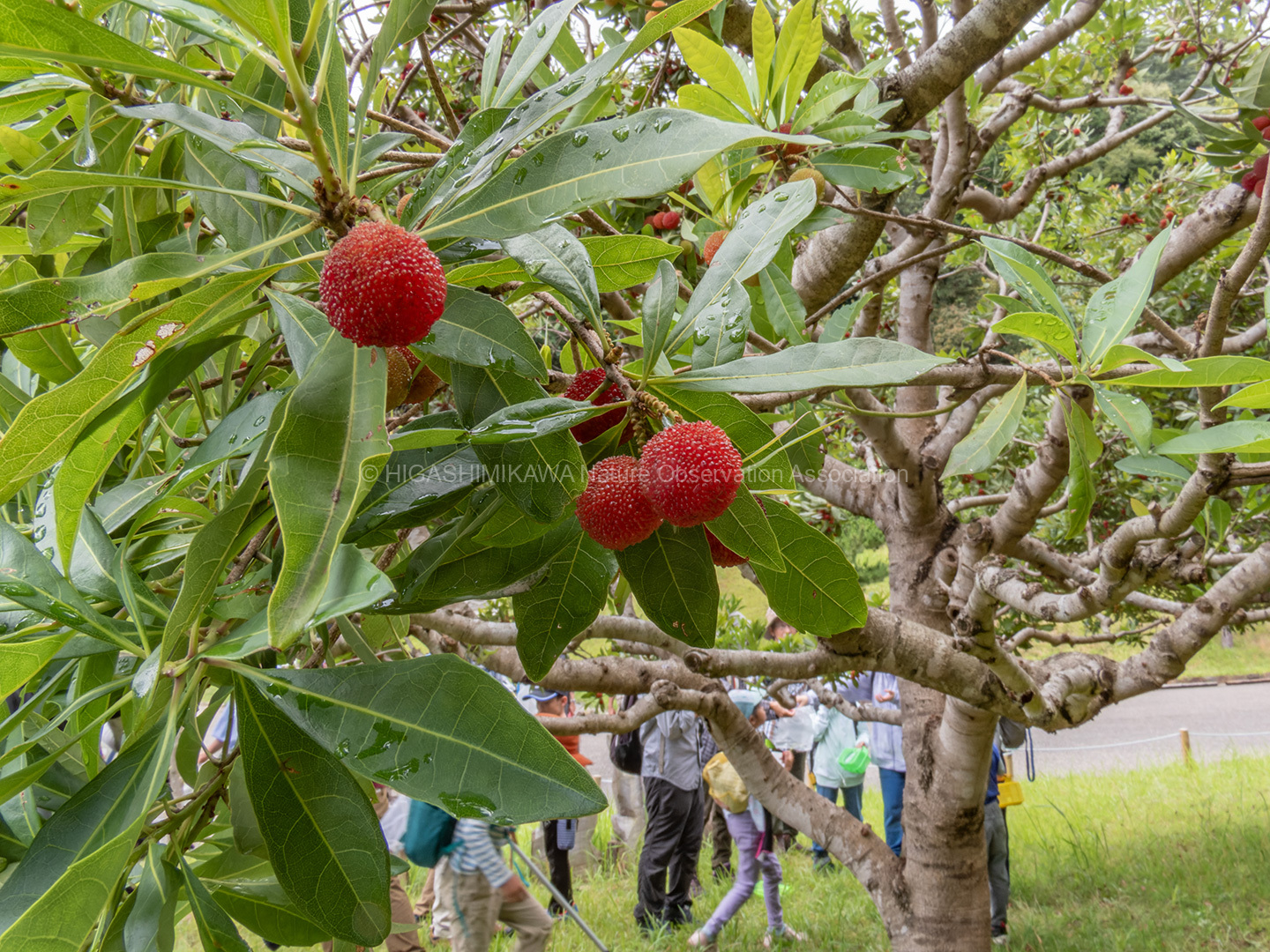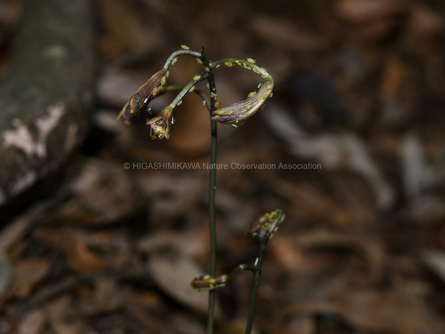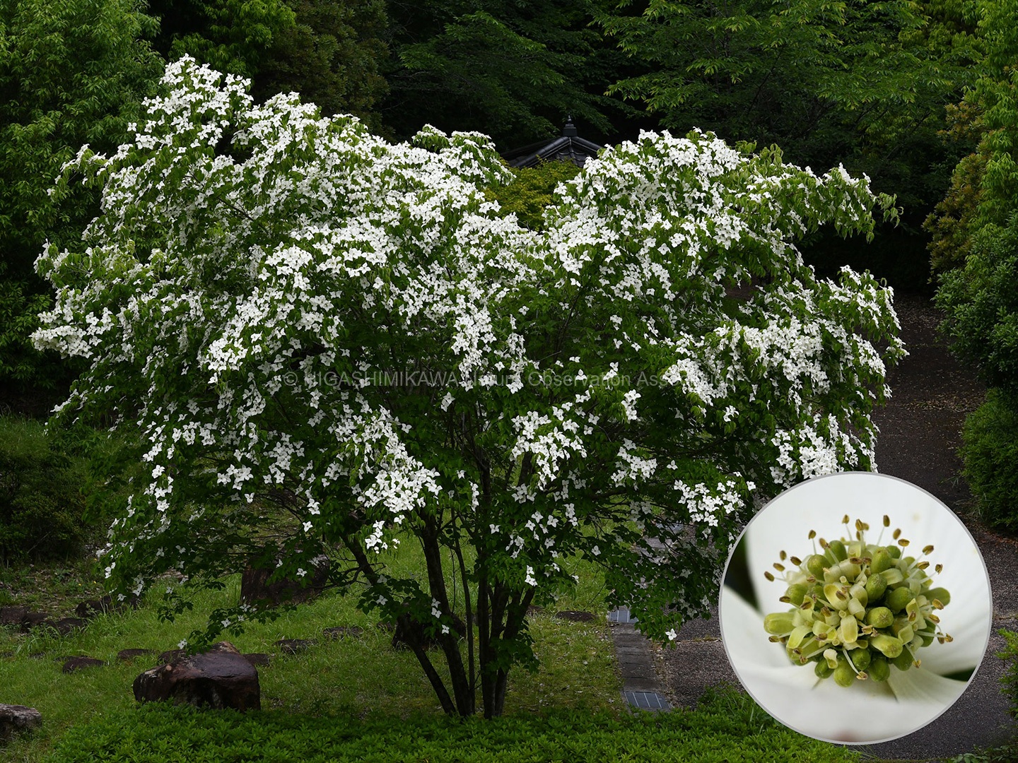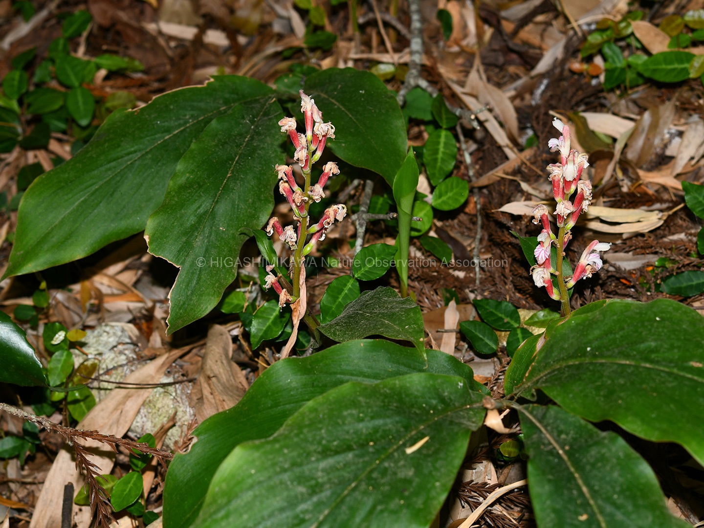 ヤエヤマヤマボウシの咲く階段脇にはササユリが開花し、ノアザミが葯を立てていた。さわると花粉が押し出されるようすを観察。ヤマボウシ、ドクダミ、ホオノキと花弁に見える苞をもった植物を紹介。コヒロハハナヤスリ、マツバランとシダに見えないシダを見てもらう。オオシオカラトンボやコフキゾウムシなどの昆虫も出現。疥癬症にかかったタヌキが姿を見せる。あまり人を怖がっていない。池のはたにはムヨウランが花茎をあげていた。ホトトギスに托卵されるウグイスが盛んに谷渡りの声で鳴いている。警戒しているようだ。ハシブトガラスの澄んだカアカアと言う声。トビを追いかけるようすも観察。シソバタツナミの花や甲羅干しをするミシシピーアカミミガメ、ウシガエルも観察できた。