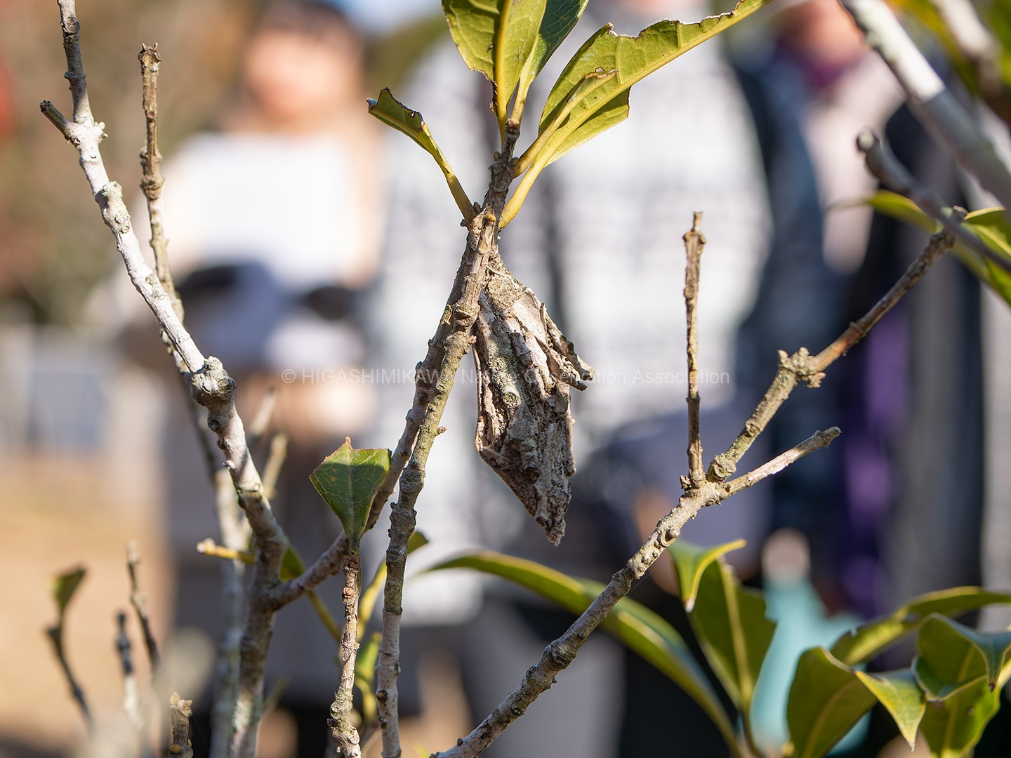 修景庭園では、オオスカシバに食べられたクチナシと、その根本のイノシシの掘り返し跡を観察しました。