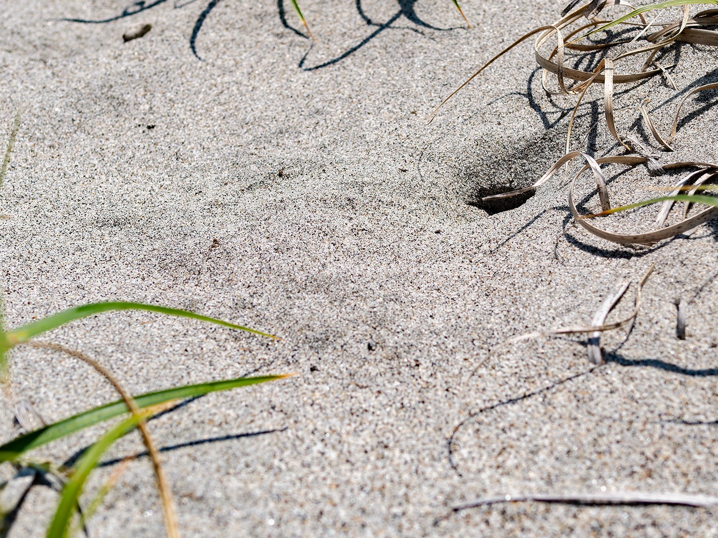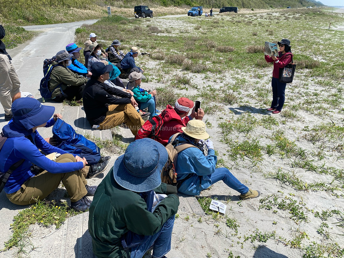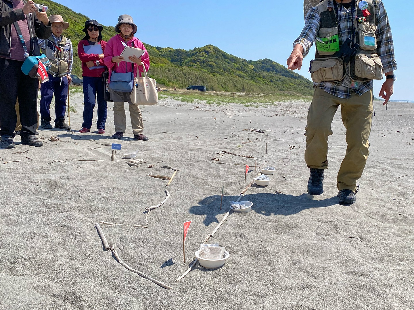 砂浜の動物ではスナガニの巣⽳、シロチドリの営巣を確認した。アカウミガメについては話と紙芝居で伝えた。