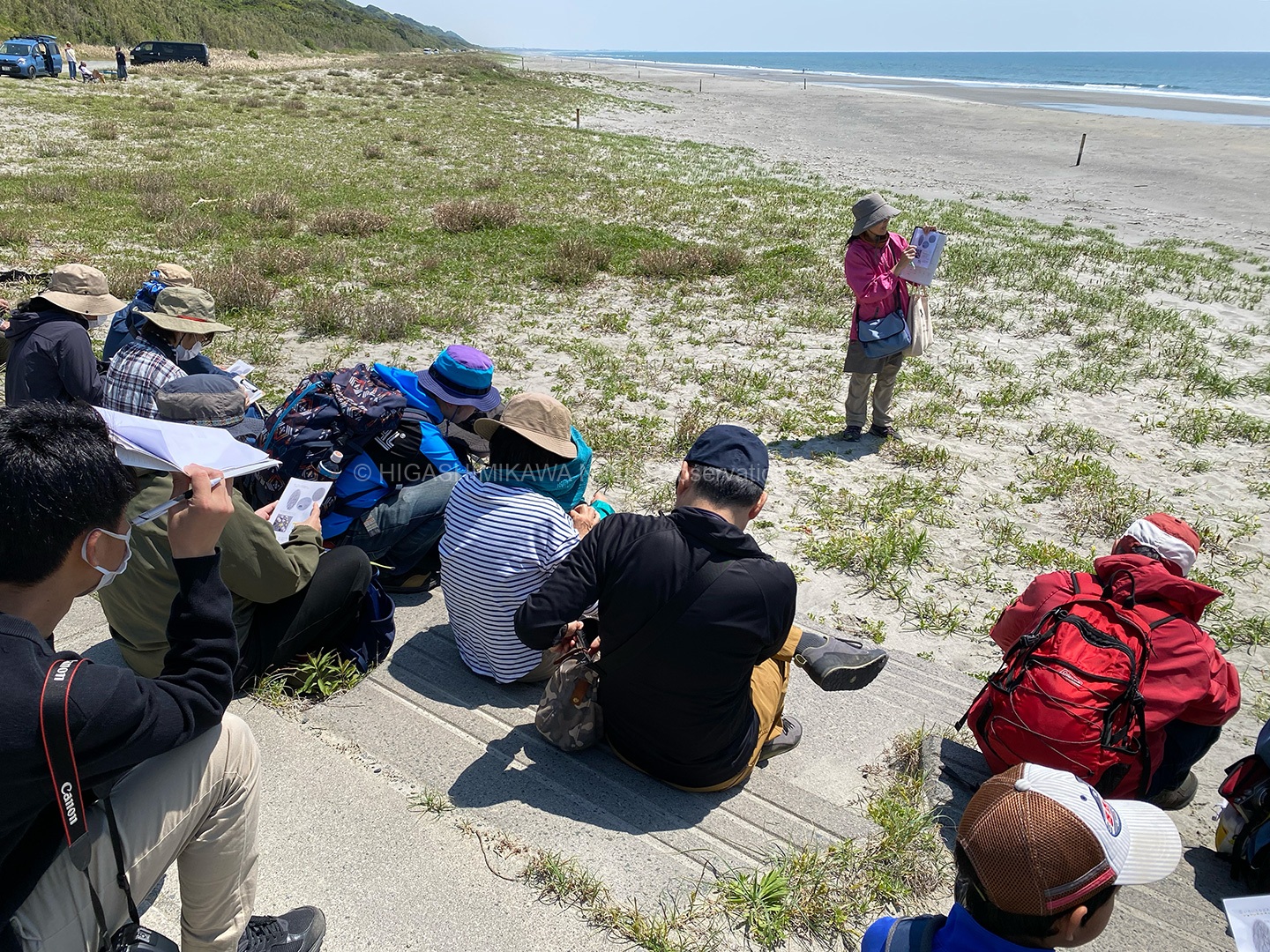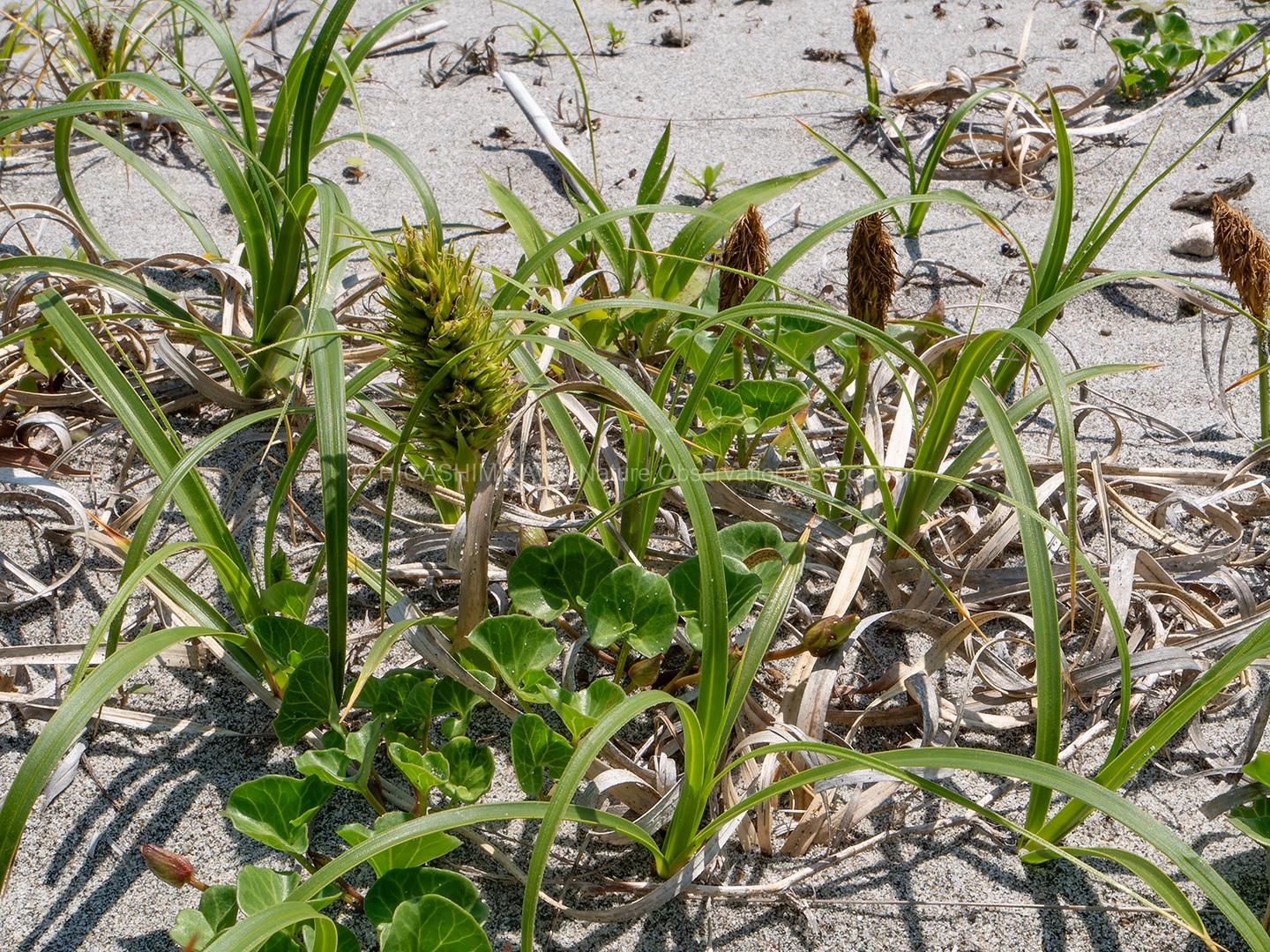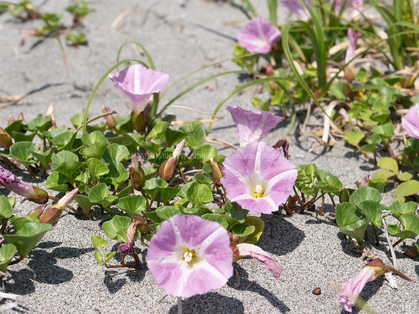 後背地の林は海岸性の樹⽊や暖地性の樹⽊・暖地性の蔓植物が多く⾒られ、砂浜では海浜植物が観察できた。(コウボウムギ・コウボウシバ・ハマニガナ・ハマヒルガオ・ハマダイコン・ハマエンドウ・ハマボウフウ・ケカモノハシなど)
