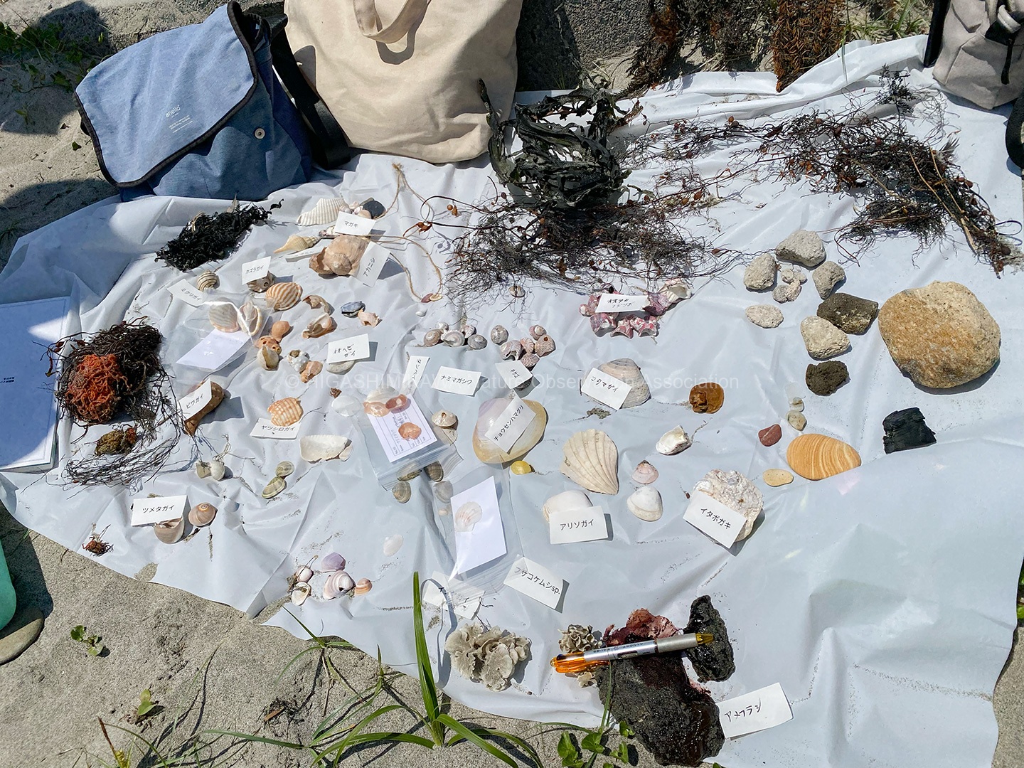 漂着物は何種類かの⾙殻や海藻類・軽⽯・⿂の⾻・フジツボ類などがあった。全体にゴミが少なくが良かった。