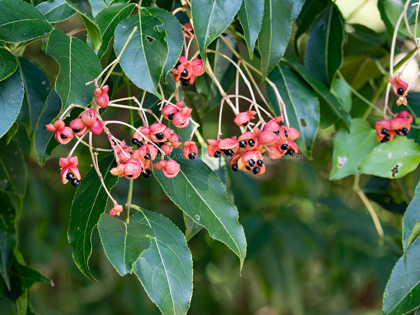 今回の観察会はヒガンバナの紙芝居から始まりました。「花が咲いている時には葉が無い」と言っていたので、ヒガンバナのつぼみを見つけた時に葉を探すと本当にありませんでした。修景池の周りでは、ゴンズイの赤と黒のよく目立つ実を見ました。赤色は果皮で黒色は種です。上の方を見ると緑色のミツバアケビの実もありました。これから紫色になっていきます。林縁のクチナシの緑の実はこれから橙色に色づいていきます。林道を歩いているとたくさんドングリの実が葉っぱ付きで落ちていました。観察するとチョッキリの仲間が枝をちょきんと切ったあとがありました。道路わきの崖面ではキノコがたくさん出ていました。ひだのあるキノコや管孔を持つキノコなどを見て説明を聞くと、周りに多くのキノコを発見することができました。上を見上げると、小さな鳥が木の枝を飛び回っています。ヤマガラです。大好物のエゴノキの実を運んだり、食べたりしていました。最後にクズやオミナエシなどの秋の花を見て観察会は終了しました。