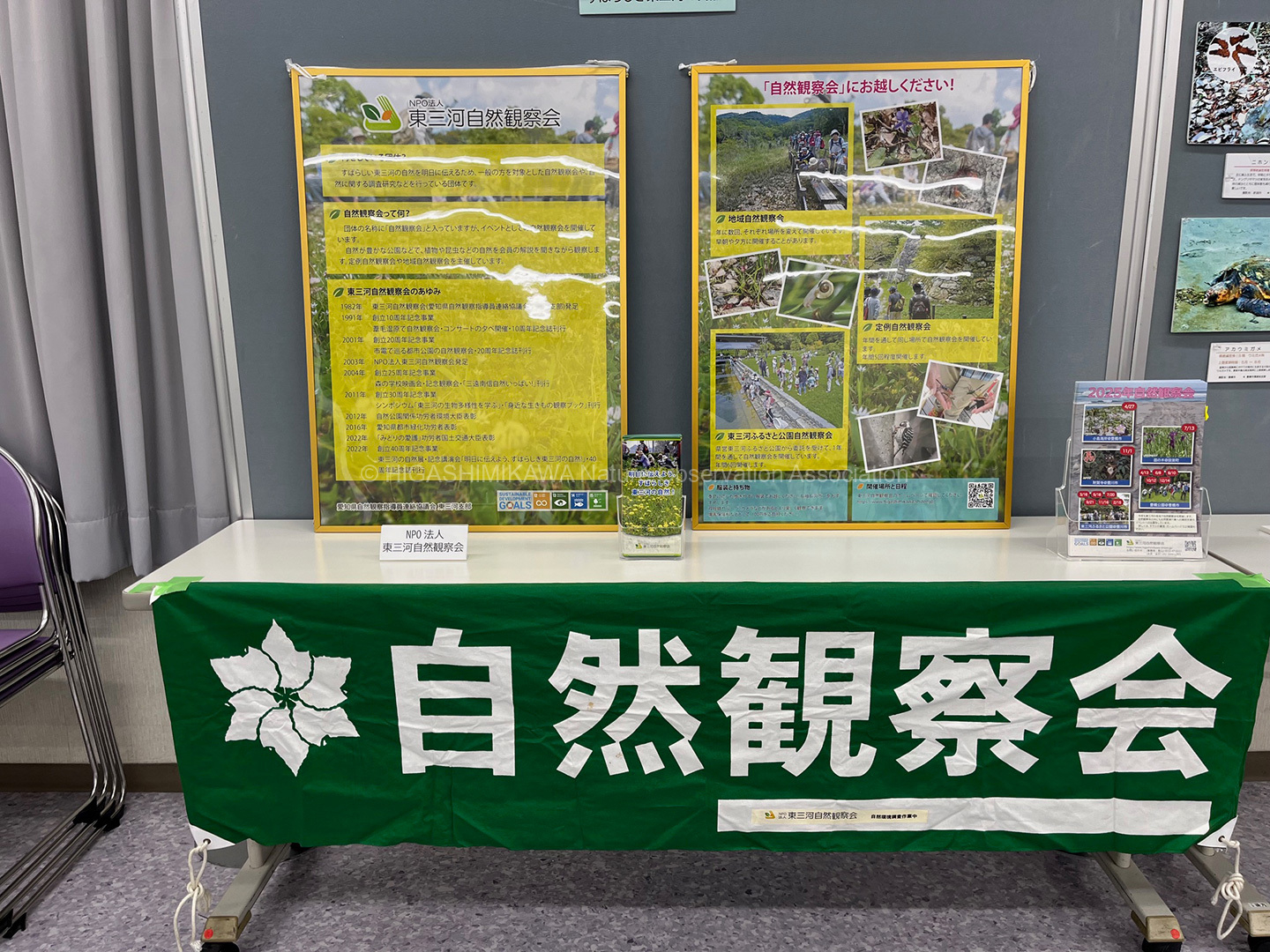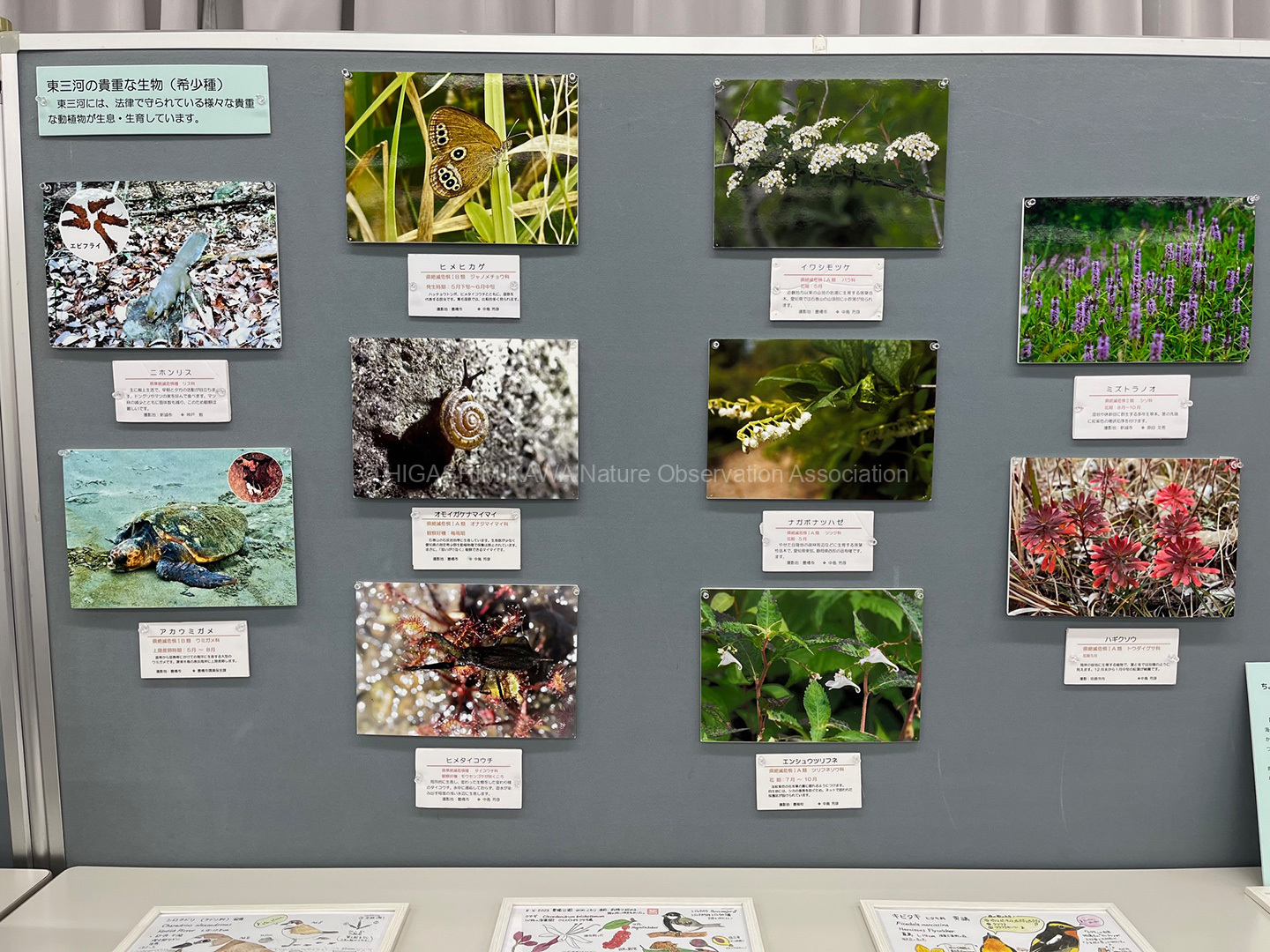 当NPOの沿革や活動を紹介するパネル展示に加え、東三河の貴重な在来の動植物や在来種に深刻な影響を与える外来の動植物に写真パネル展示と会員の製作したビデオ上映で身近な自然を見直すきっかけを作りました。