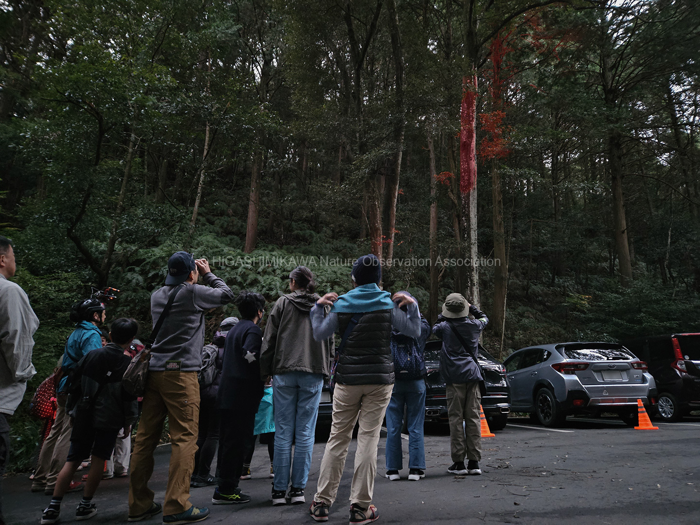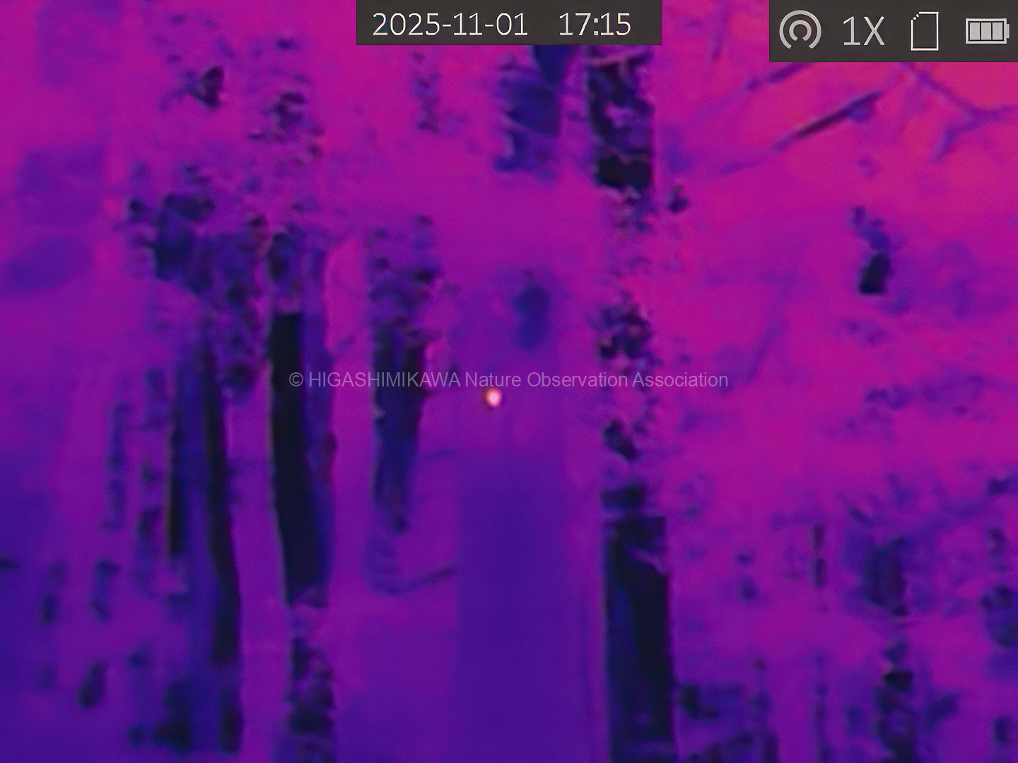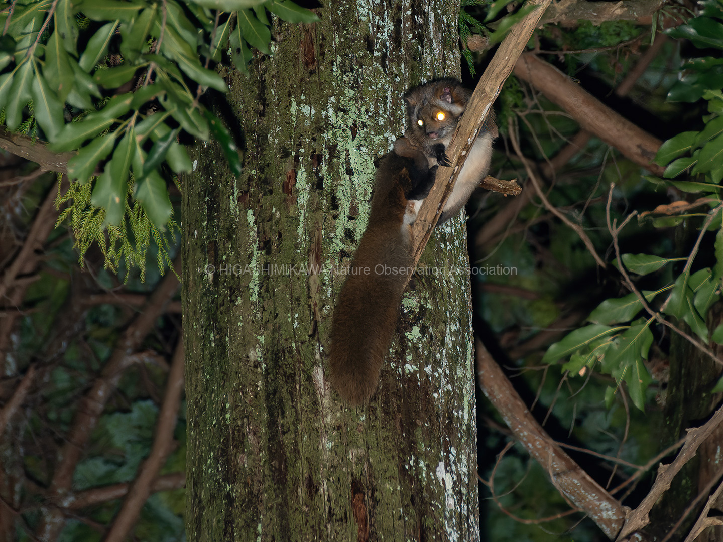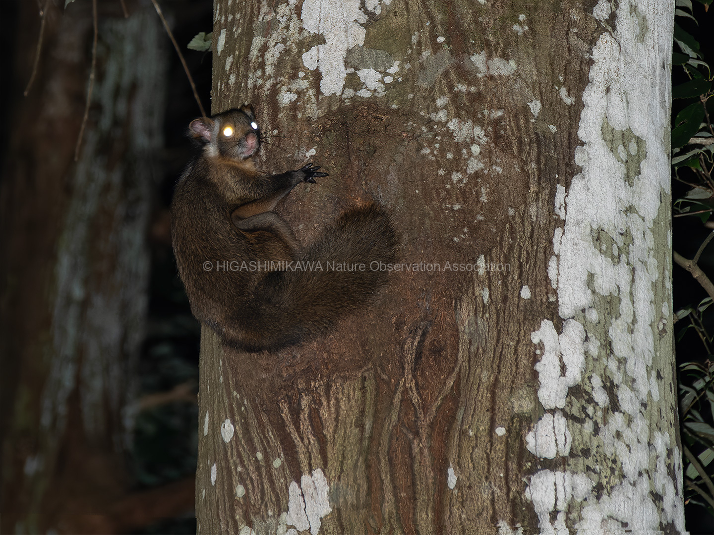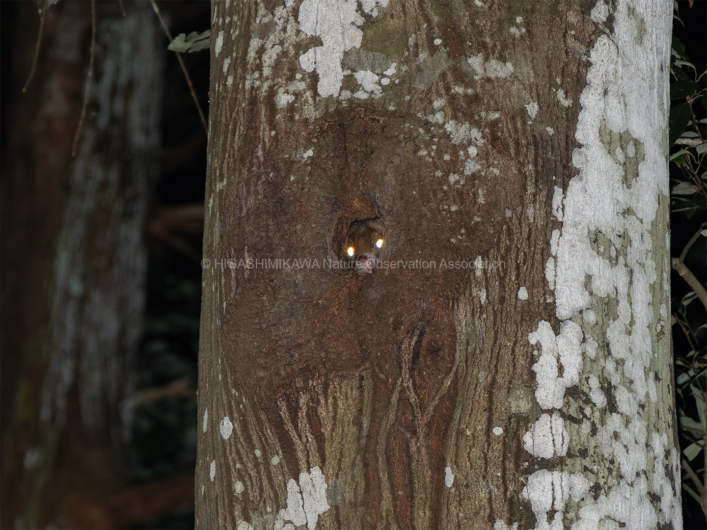 日没後にムササビの観察を行いました。巣の前で待機して、2頭のムササビの出巣を確認しました。その後、別の個体が樹上にいるのを観察し、合計3頭のムササビに出会うことができました。